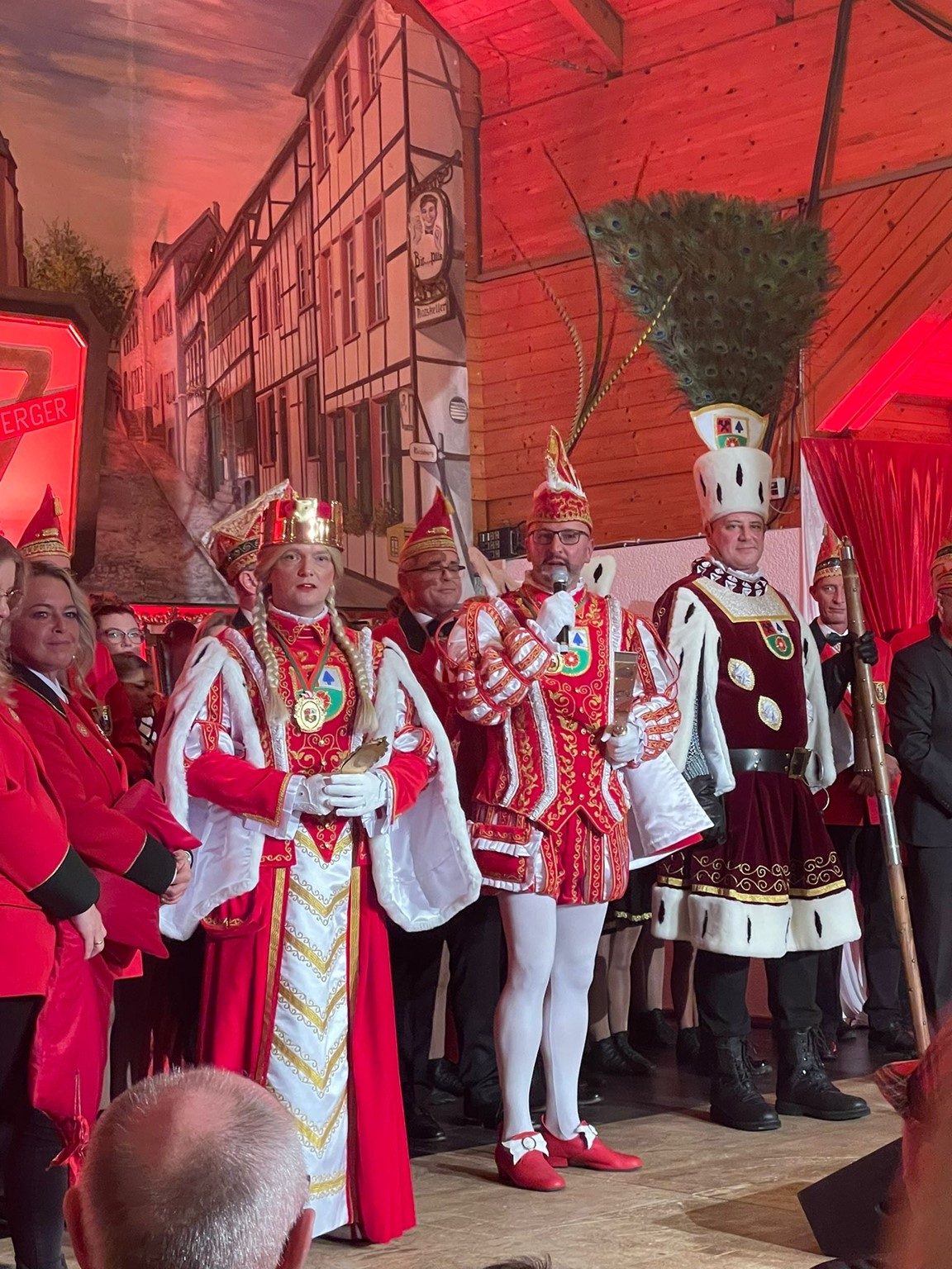Die 1. Vorsitzende der KG Greesberger, Nicole Reipen, betonte in ihrer Begrüßung die besondere Bedeutung dieser Proklamation: „Prinz Günter I., Bauer Thomas und Jungfrau Bruni sind nicht nur Vertreter unseres Brauchtums, sondern auch Vorbilder für Gemeinschaft und Integration. Mit ihrer Freude, ihrem Engagement und ihrer herzlichen Art zeigen sie, wie Karneval Brücken bauen kann – zwischen Alteingesessenen und Zugezogenen, zwischen Generationen und Menschen unterschiedlichster Herkunft.“ Besonders emotional wurde es bei der ersten Rede des frisch proklamierten Dreigestirns. Unter dem Sessionsmotto „Echte Fründe stohn zusamme“ hoben sie die Bedeutung von Freundschaft und Zusammenhalt in Kommern hervor. Dabei zeigten sie auch ihre persönliche Verbindung zur Dorfgemeinschaft: Sowohl Prinz Günter als auch Bauer Thomas sind vor ca. 20 Jahren nach Kommern gezogen und nutzten die Gelegenheit, ihre Dankbarkeit für die herzliche Aufnahme in die Dorfgemeinschaft auszudrücken. Ihr umgetextetes Lied „Du bes Kommere“ war ein musikalischer Liebesbrief an das Dorf und sorgte für große Emotionen und viele Gänsehautmomente. Der stimmungsvolle Höhepunkt des Auftritts des Dreigestirns war dann ihre Hymne „Dreigestirn der Eifel“, welche sie gemeinsam mit Stefan Brings eingesungen hatten und in die stimmungsgeladene Bürgerhalle schmetterten. Eine Hommage an die Eifel und das Lebensgefühl dieser Region ließ die Halle toben und machte die Feier zu einem unvergesslichen Erlebnis.