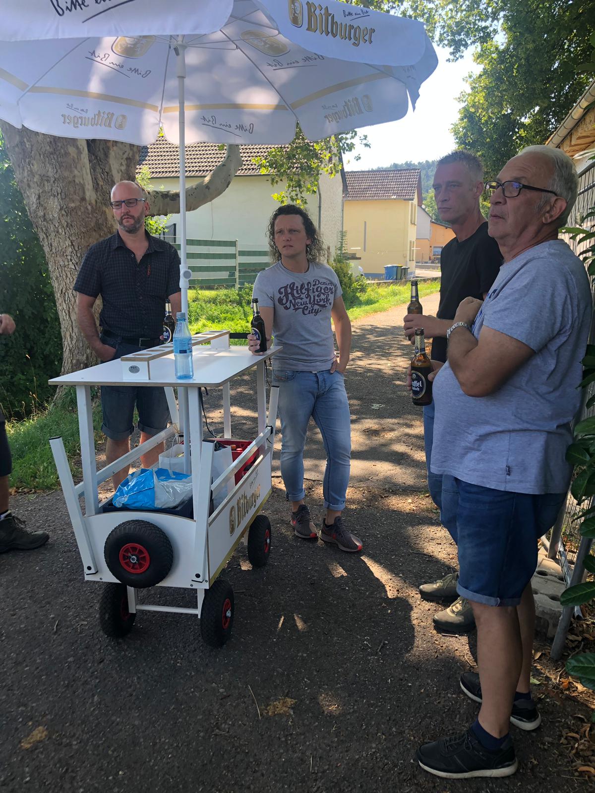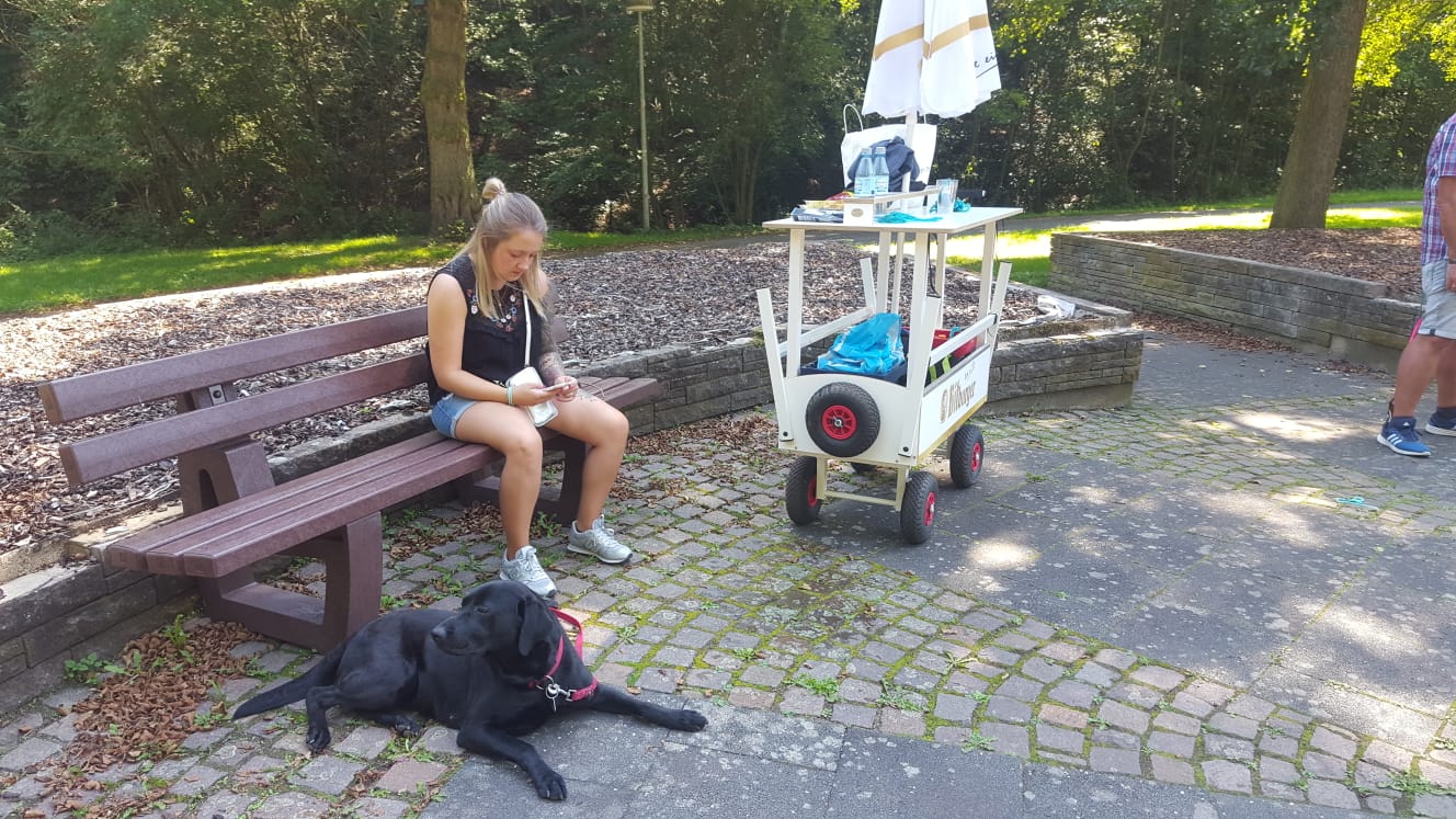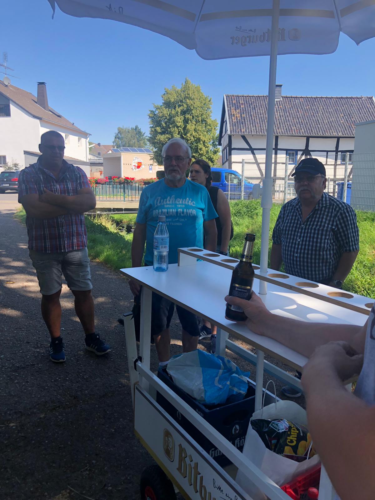 (24.08.2019) Früh ging es am Samstagmorgen für unseren Vorstand los. Ein voll beladener Bollerwagen sorgte für gute Stimmung und half dabei, dass wir für den Fußweg bis zum Mühlenpark ausreichend Flüssigkeit zu uns nahmen.